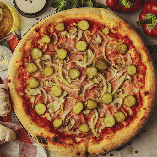 sos pomidorowy, mozzarella, szynka, pieczarki, cebula, boczek, ogórek