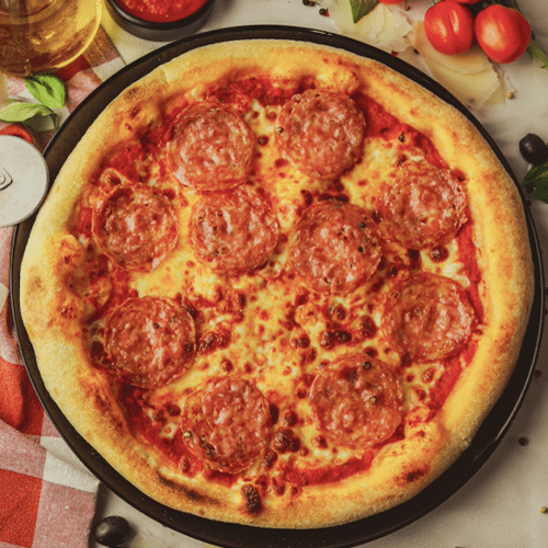 sos pomidorowy, mozzarella, salami napoli, pieczarki